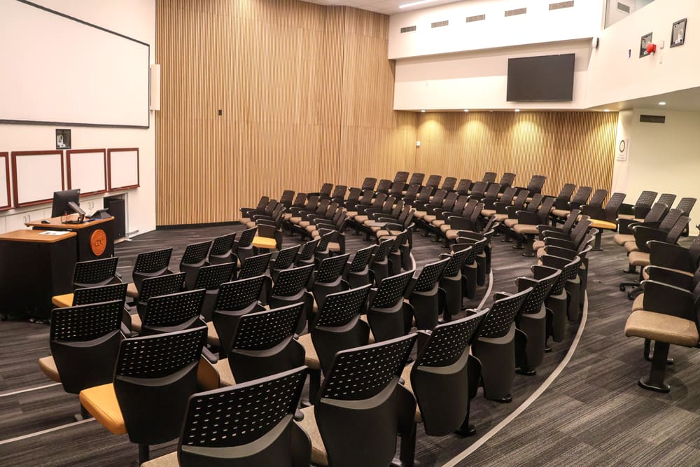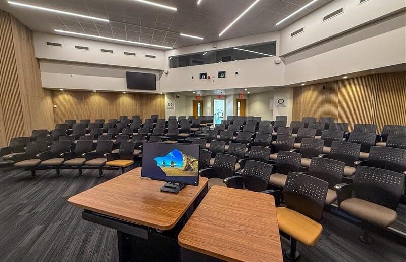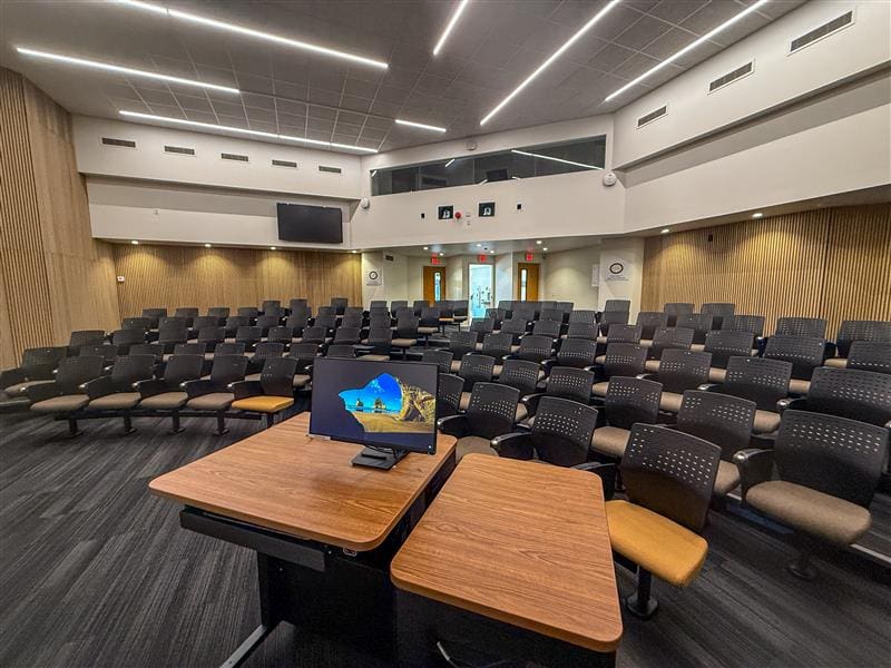 The revitalized hall now seats 104, an increase from 80, and features new lighting, acoustic paneling to improve sound quality, new finishes, fresh paint, and new flooring throughout. Students and guests will also benefit from a state-of-the-art audio/visual system, a modern podium, and upgraded doors, ensuring the space is both technologically advanced and aesthetically inviting.